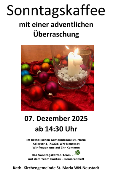 Zu unserem letzten Café in diesem Jahr laden wir Sie ganz herzlich am 4.12.2025 um 14.30 Uhr in den Begegnungsraum in Hohenacker ein. Mit musikalischer Begleitung werden wir uns auf die Advents- und Weihnachtszeit einstimmen. Außerdem werden wir Sie wieder mit Kaffee und leckeren Kuchen verwöhnen. Der erste Termin im neuen Jahr ist der 8.1.2026. Unser Team freut sich sehr über Ihren Besuch