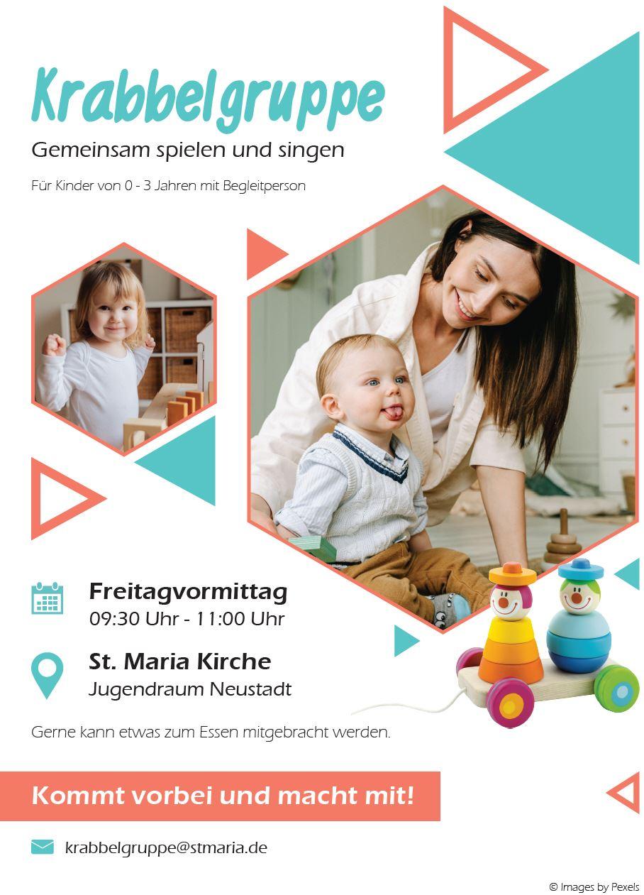 Termin: jeden Freitag von 09.30 Uhr bis 11.30 Uhr im katholischen Gemeindesaal neben unserer Kirche. Gerne dürfen Sie auch unseren Flyer herunterladen und weitergeben. Sie haben Fragen oder möchten sich vorab informieren? Dann schreiben Sie einfach eine Mail an krabbelgruppe@stmaria.de - wir freuen uns auf Ihre Nachricht!